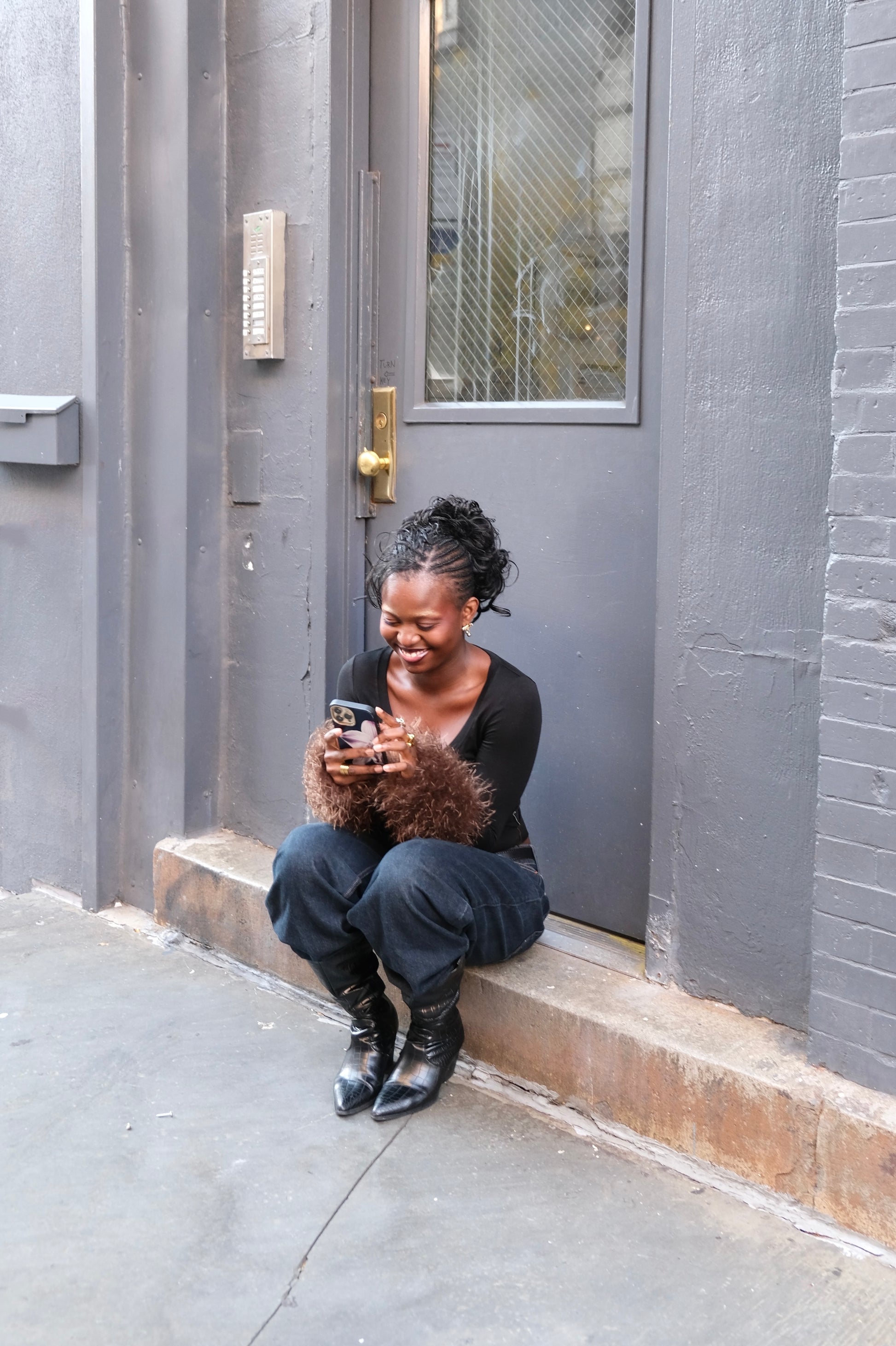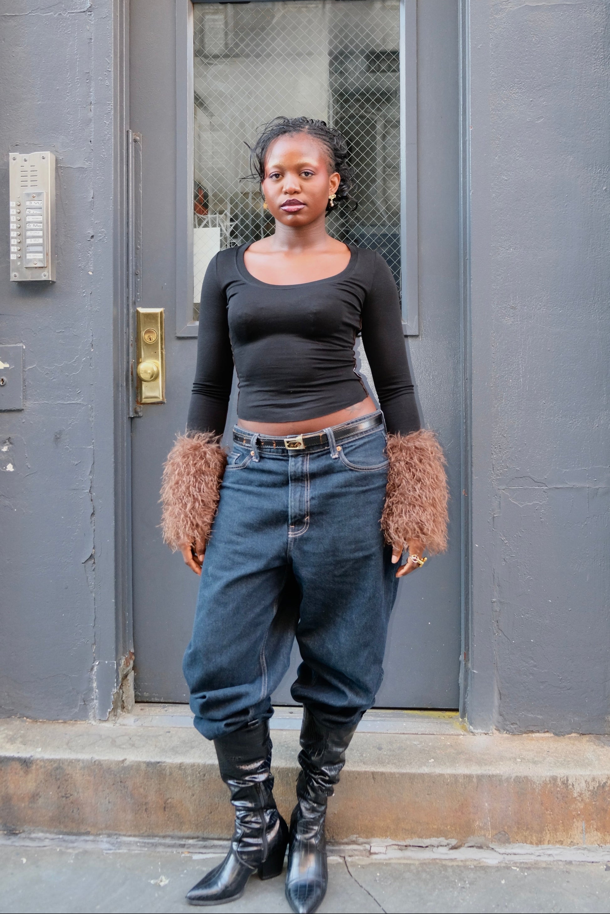 The Coco Top has a sleek black long-sleeve silhouette that is elevated with striking feathered cuffs in warm brown tones. A perfect textural touch to an otherwise classic look.