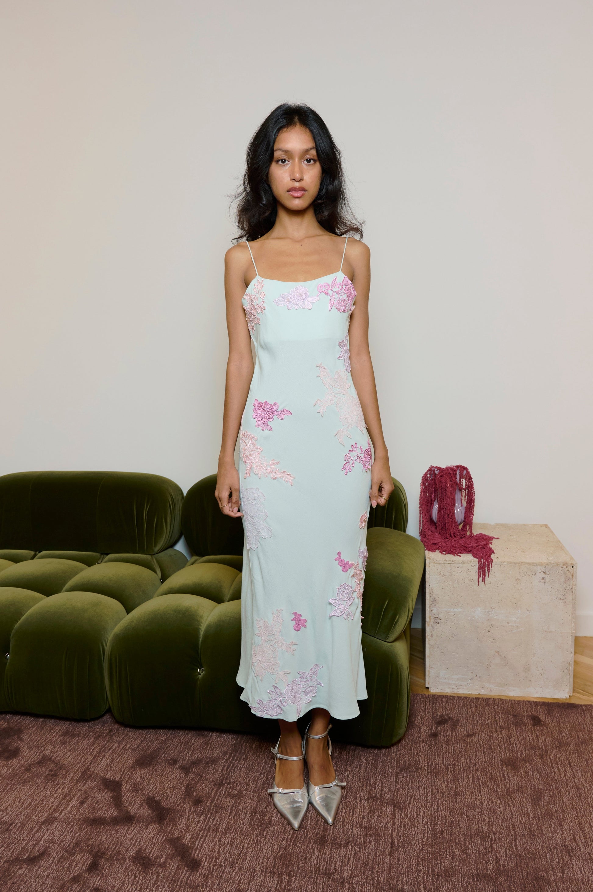 The Tyler McGillivary Eloise Dress features a midi slip silhouette with pink lace flower appliqués, making it the perfect feminine dress for cocktail parties and the works. Perfect for a romantic summer wedding, traveling the world, or a day in the city.