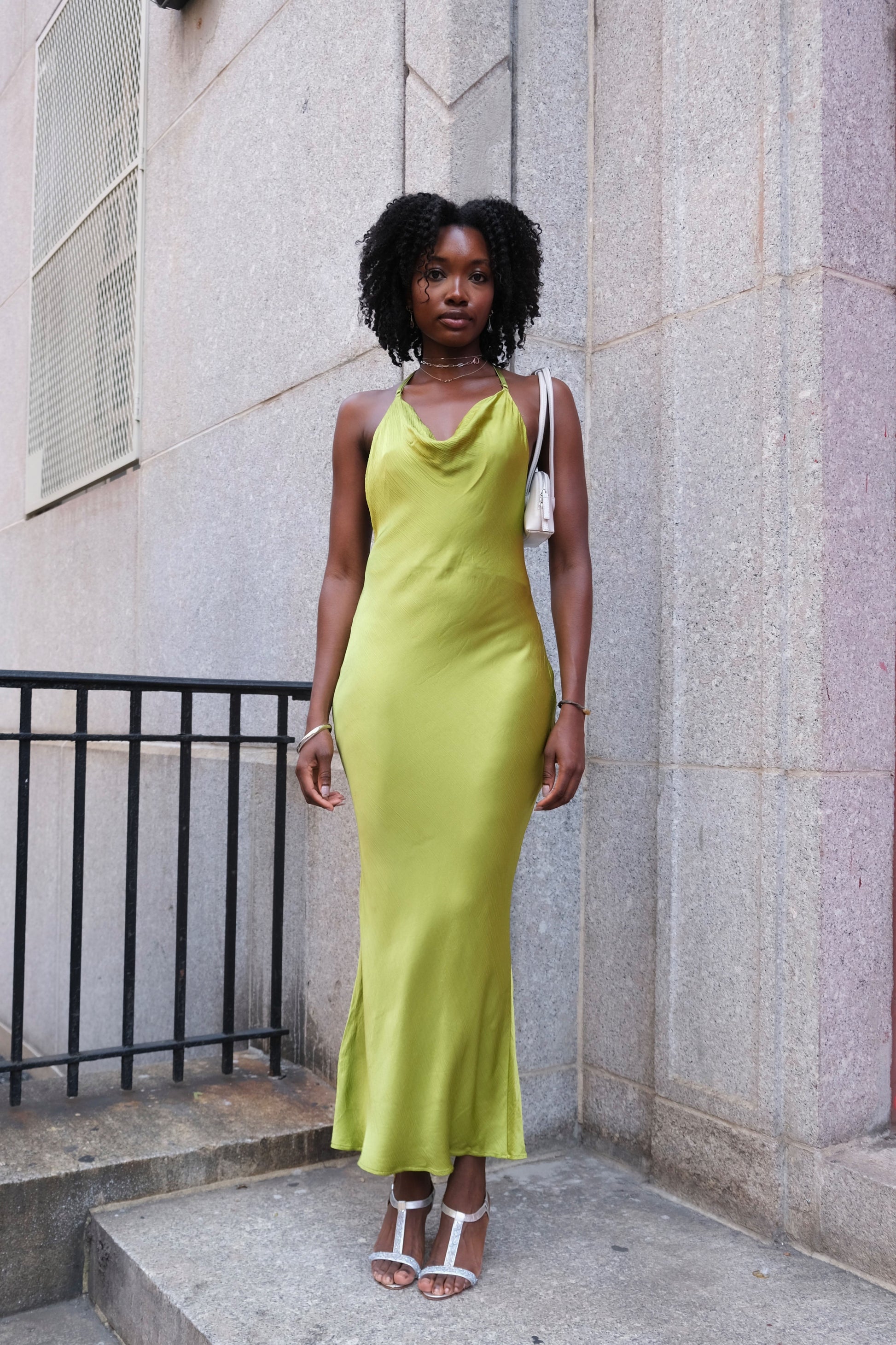 In color Chartreuse Green, a stunning shade perfect for wedding guests. Model is 5'10" and wearing size M.