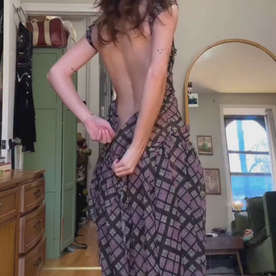 Stand out in the Plaid Puff Dress in Purple Tartan, a semi-sheer chiffon silhouette with playful puff detailing, asymmetrical skirt, and open back, perfect for special occasions, daytime events, and elevated everyday style.