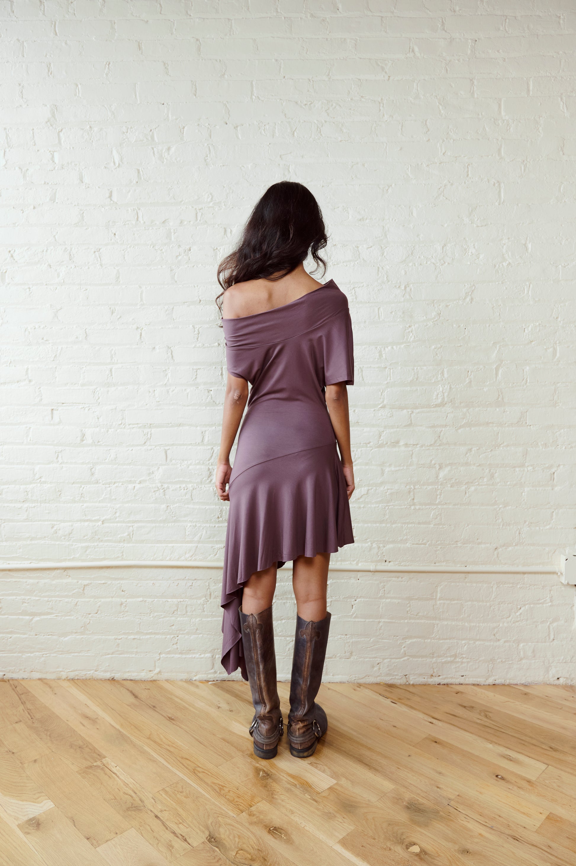 The Plume Dress features a mock neckline, asymmetrical waterfall shoulder, and asymmetrical flounced hemline in a body snatching fabric. It can be worn in a one-shoulder or boat neck style, two looks in one!