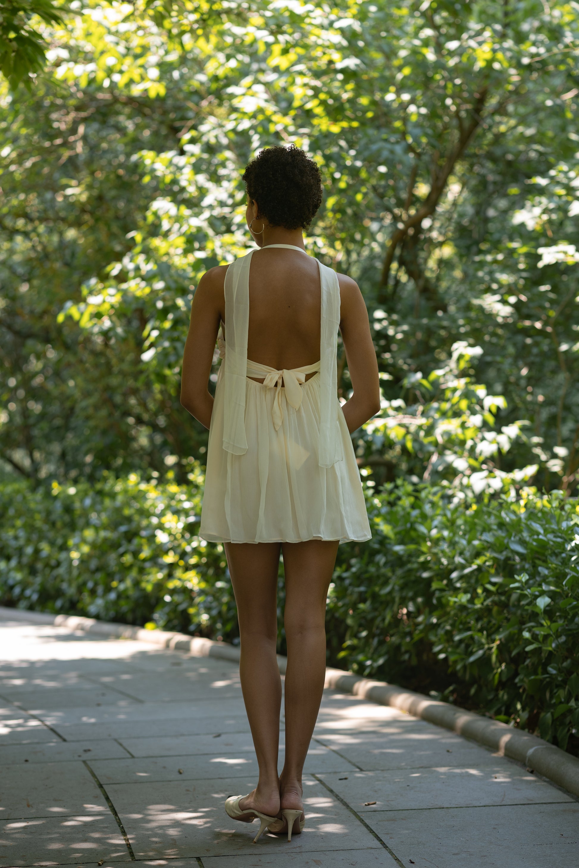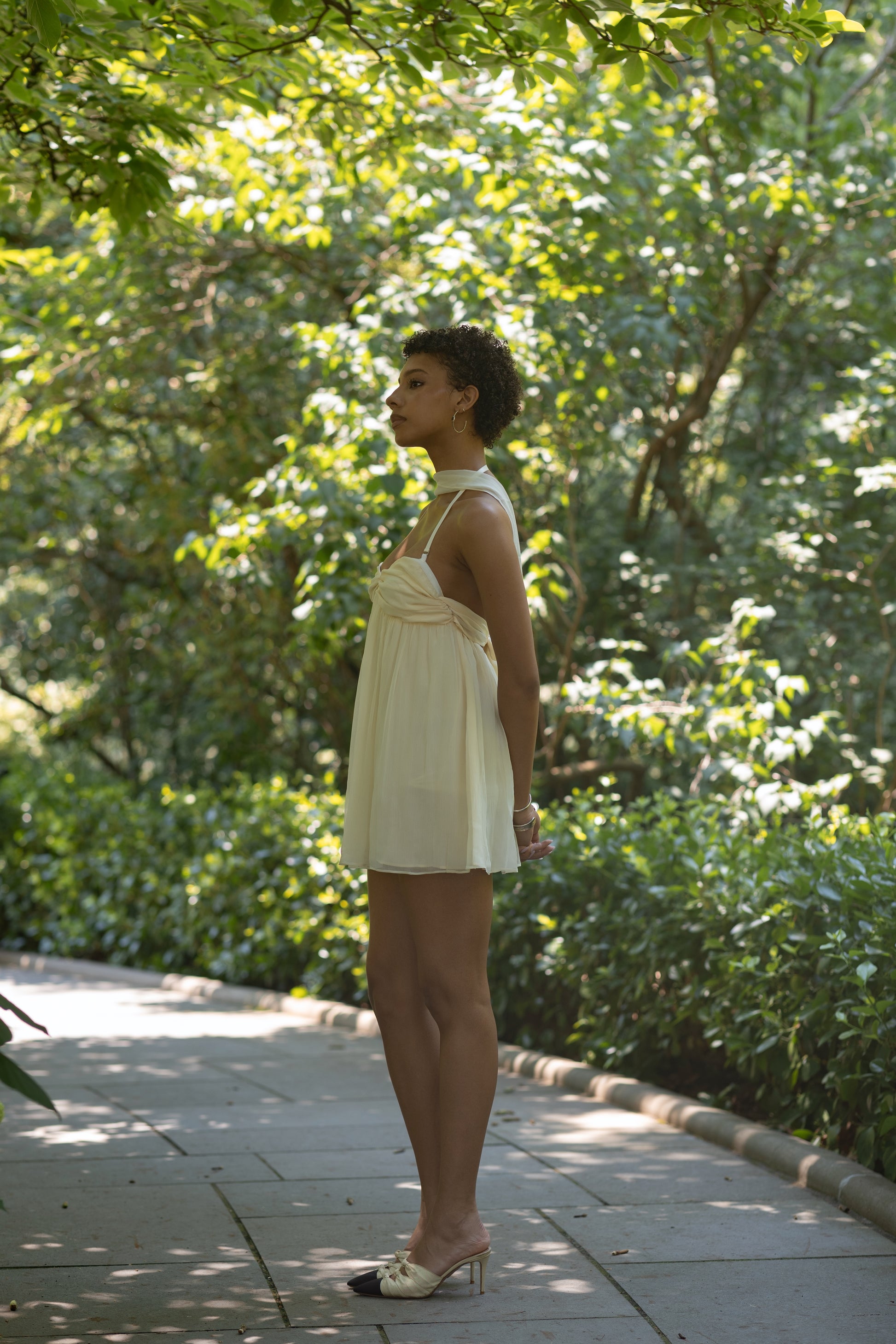 The Powderpuff Dress in butter yellow is the perfect dainty mini dress. With its strapless neckline, light fabric, and flowy design, this dress is the perfect companion for a hot summer day. Dress it up with a pair of heels, or keep it casual with some ballet flats.