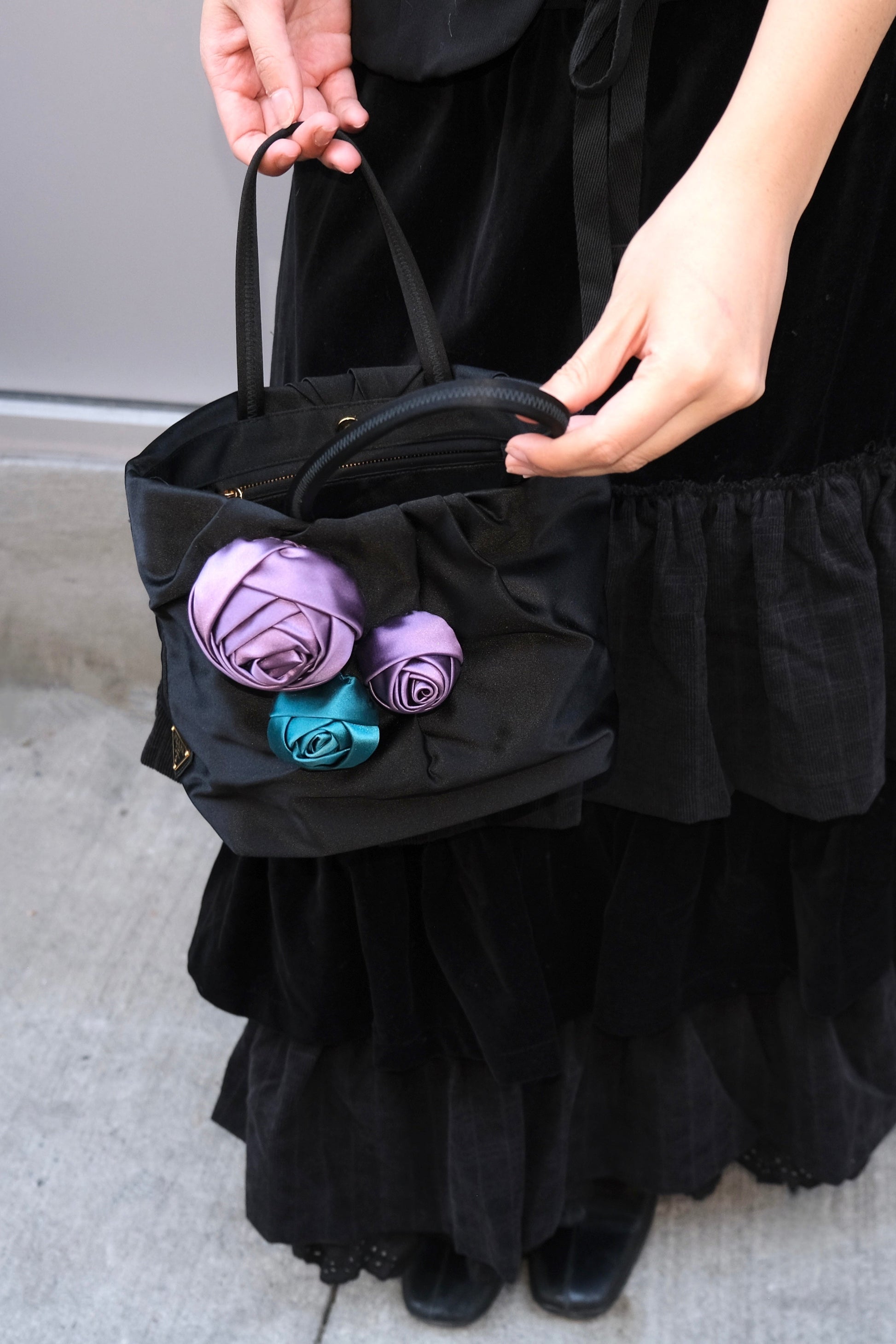 The most adorable black fabric Prada Mini Bag with unique Rose Applique embellishments and a chic top handle. The small size is perfect for an occasion and eveningwear. Make this unique piece of Prada history yours for a rental or a purchase.