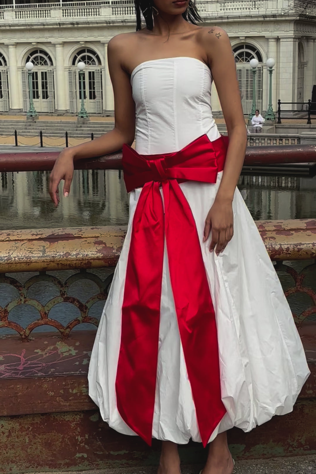 This special piece is an adjustable sash bag made in a heavyweight satin that was designed to be worn crossbody or as a belt. It features a hidden zip closure behind the bow.