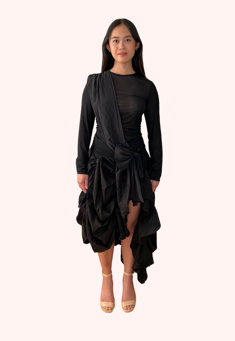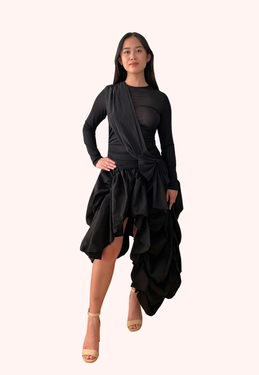 This sheer long sleeve mesh number features a built-in black sash with the most darling bow. Slightly stretchy. Designer color: Black