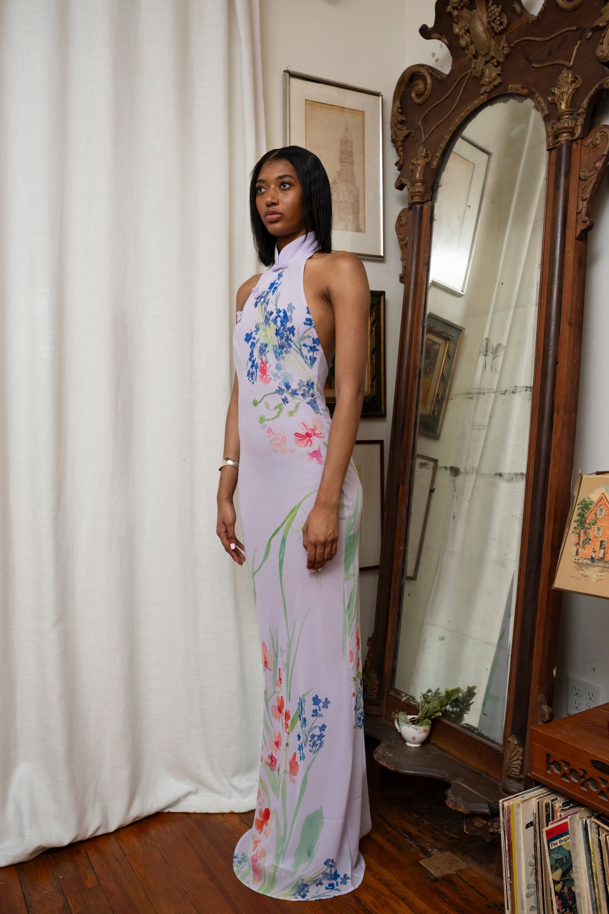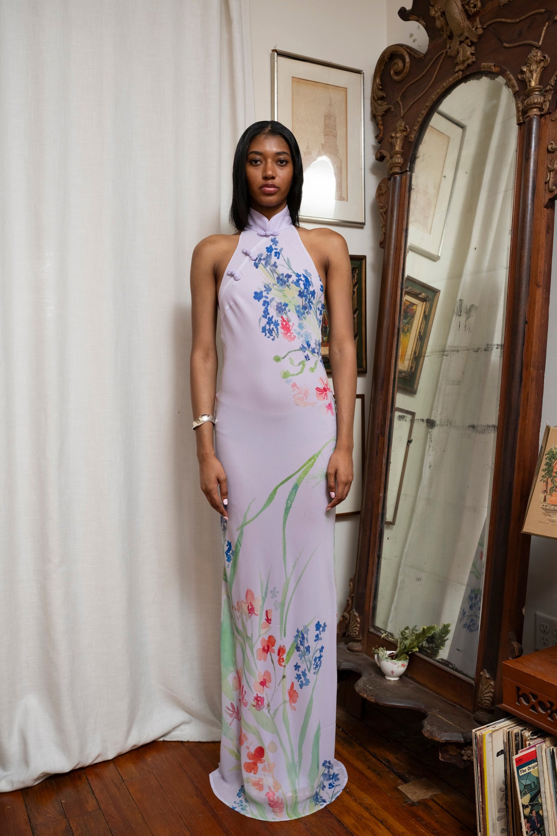 The Gillian Dress is a backless chiffon Cheongsam dress with a bias-cut maxi length and a Mandarin collar featuring the signature Sau Lee hand-tied pipa knot button detail. Cut from the most darling lavender, floral fabric, this high neck style is the ultimate occasion dress.