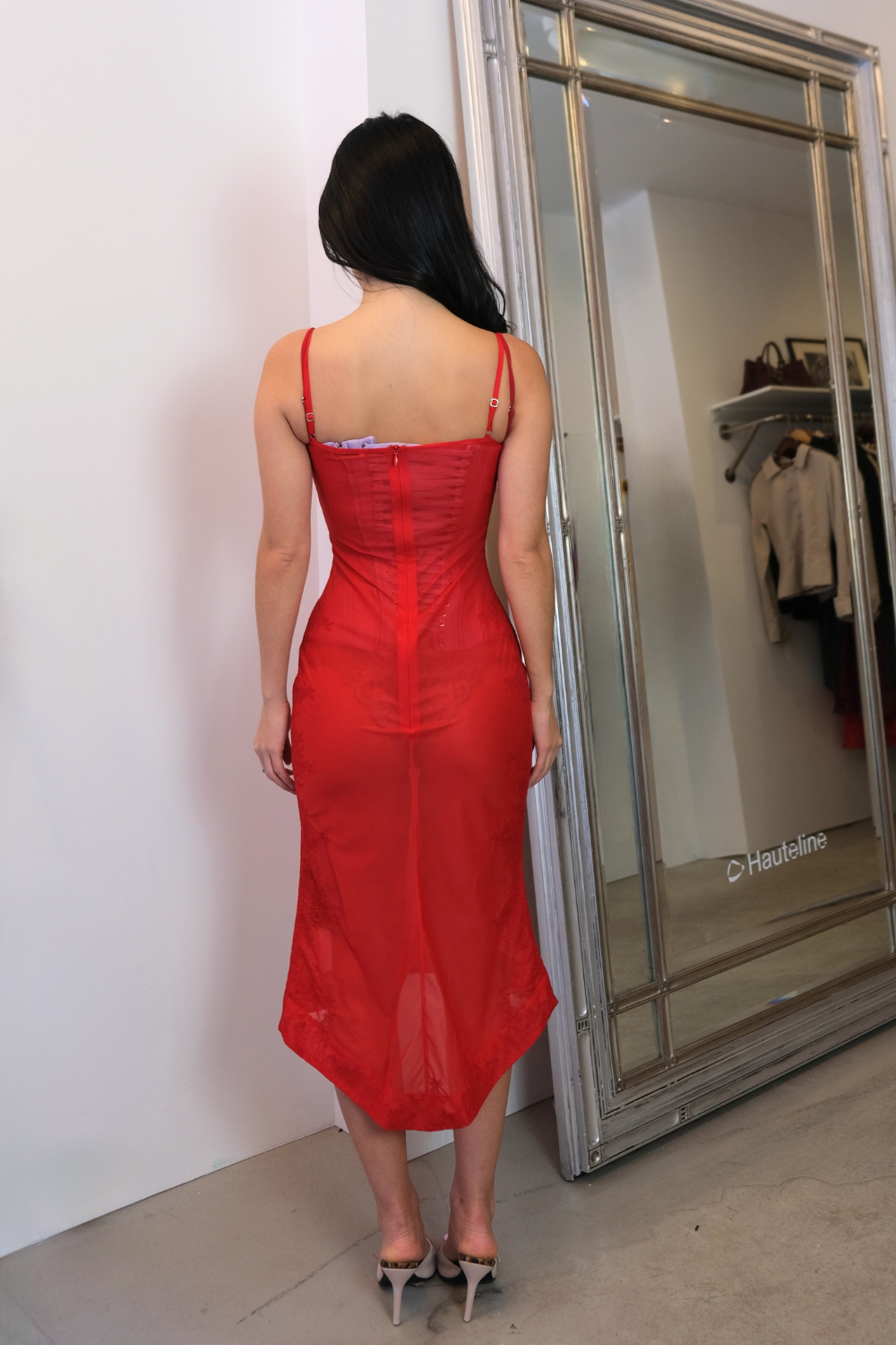 The Slip Midi Skirt is a deconstructed skirt that can be worn as a dress or skirt. A semi-sheer fabric with a high-low hemline and lace applique highlights on the sides. Pair with the uncladding bustier corset for a daring look perfect for a special occasion.