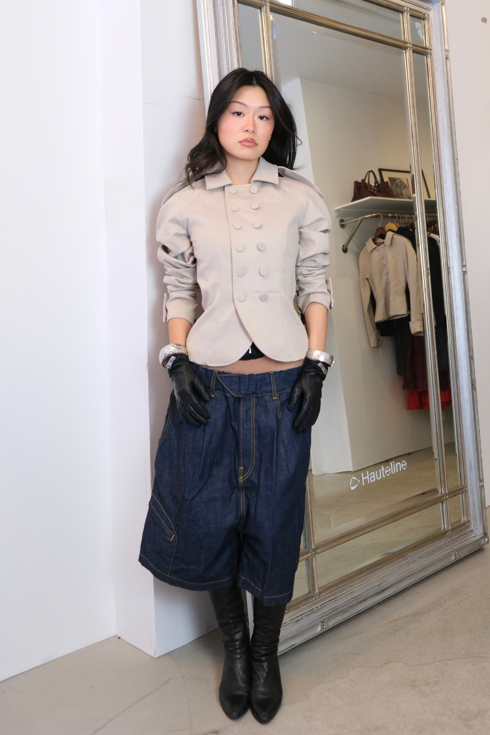 The Fanci Club Victoria Double-Button Jacket is a double-breasted button jacket with a slim fit. The waist tailored silhouette and slightly curved hemline with slight flare invites a range of styling ideas from ruching the sleeves to wearing the jacket as a top. Pair with a classic Fanci Club corset for a daring look or with a cotton shirt and jeans for your everyday adventures. Also available in Black.